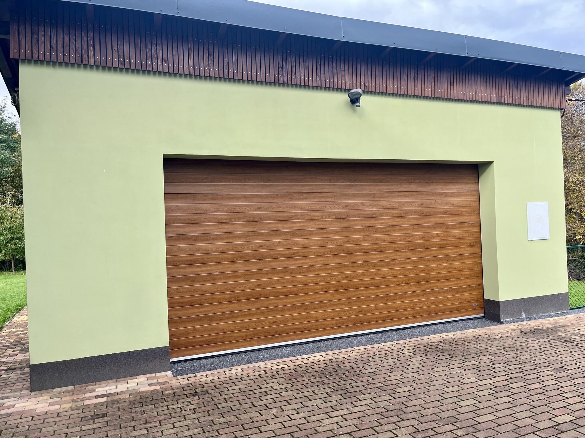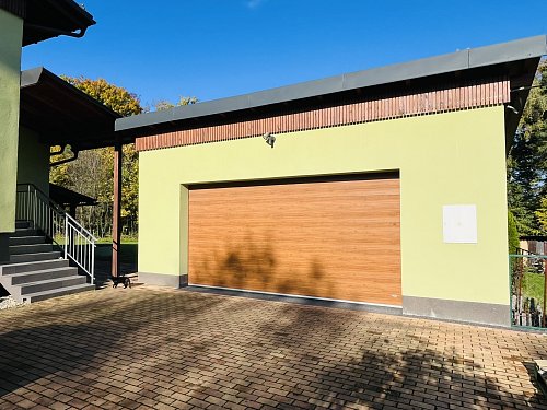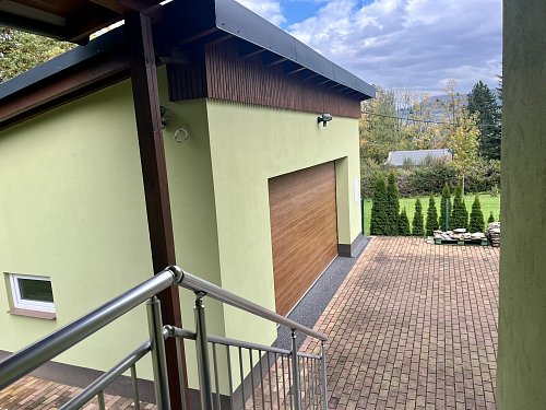 Garáž je navržena pro dvě auta nebo dodávky s možností úložného prostoru po stranách v regálech a je vytápěná. Krytina střechy je z modifikovaného pásu.