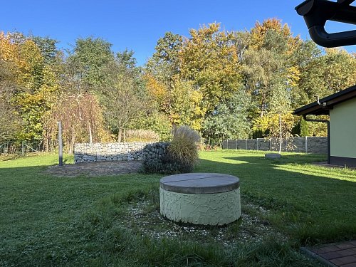 Zahrada celkem o výměře 2511m2, zastavěná plocha domu je 109m2 a zastavěná plocha garáže 63m2.