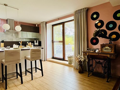 1 NP tvoří vstup do zádveří s úložným prostorem, samostatné WC, chodba se schodištěm do patra, koupelna se sprchovacím koutem a umyvadlem s velkou vestavěnou skříní a z části slouží jako prádelna, součástí koupelny je i samostatná místnost pro úschovu úklidových potřeb. Společné rodinné zázemí zahrnuje kuchyň s jídelnou a obývacím pokojem, kde se nacházejí praktická krbová kamna pro chladné večery. Z obývacího pokoje je vstup na terasu s posezením a výhledem na okrasnou zahradu se vzrostlými keři, které zajišťují soukromí.