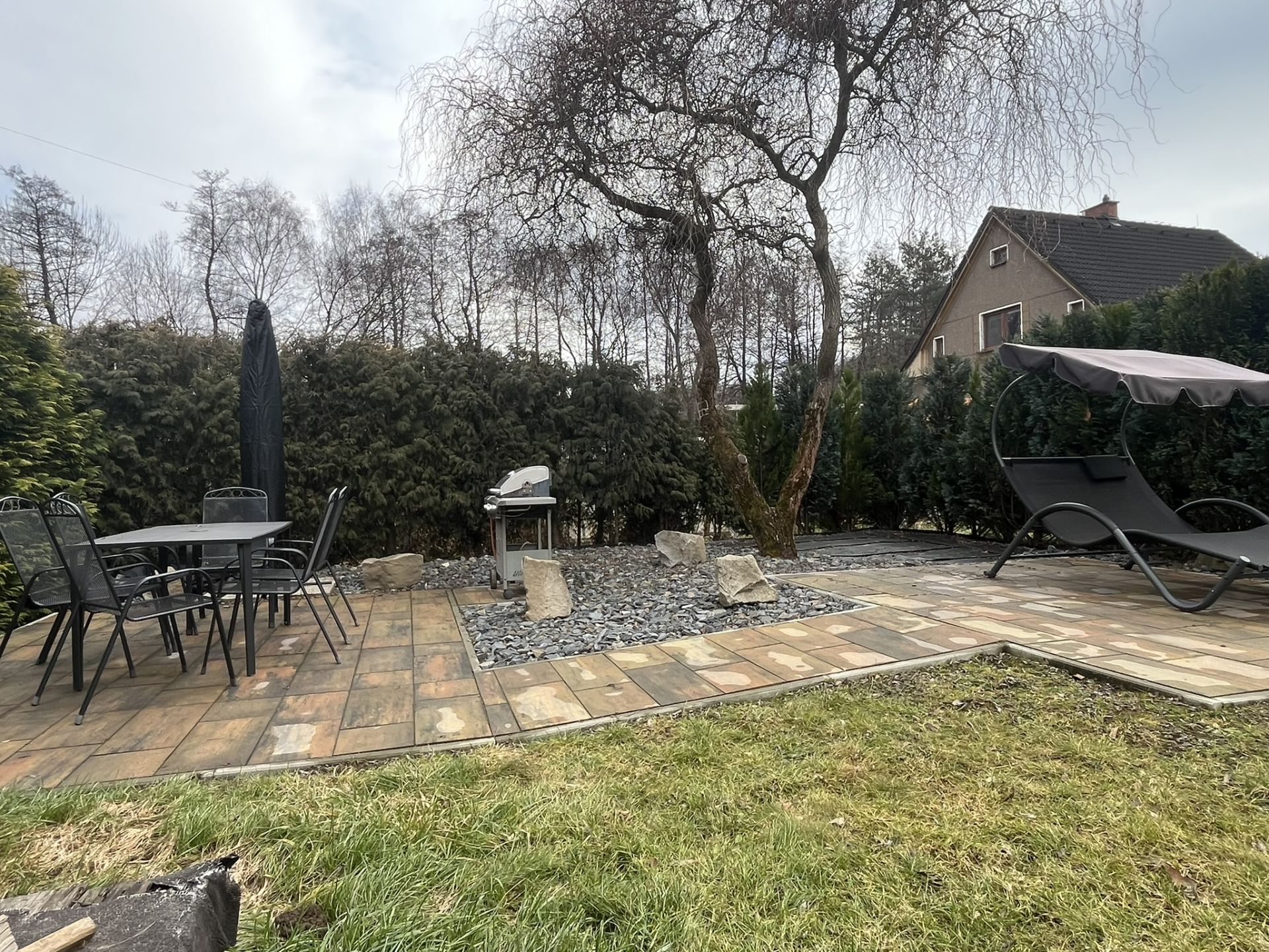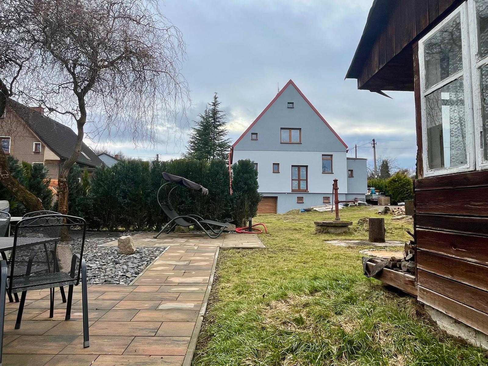 Zahrada je prostorná a nabízí vzrostlé stromy, které zajišťují potřebné soukromí. Najdete zde vybudované posezení, zahradní domek pro úschovu zahradních potřeb, použitelný skleník a studnu s užitkovou vodou, což z ní činí ideální místo pro relaxaci a rodinné aktivity.