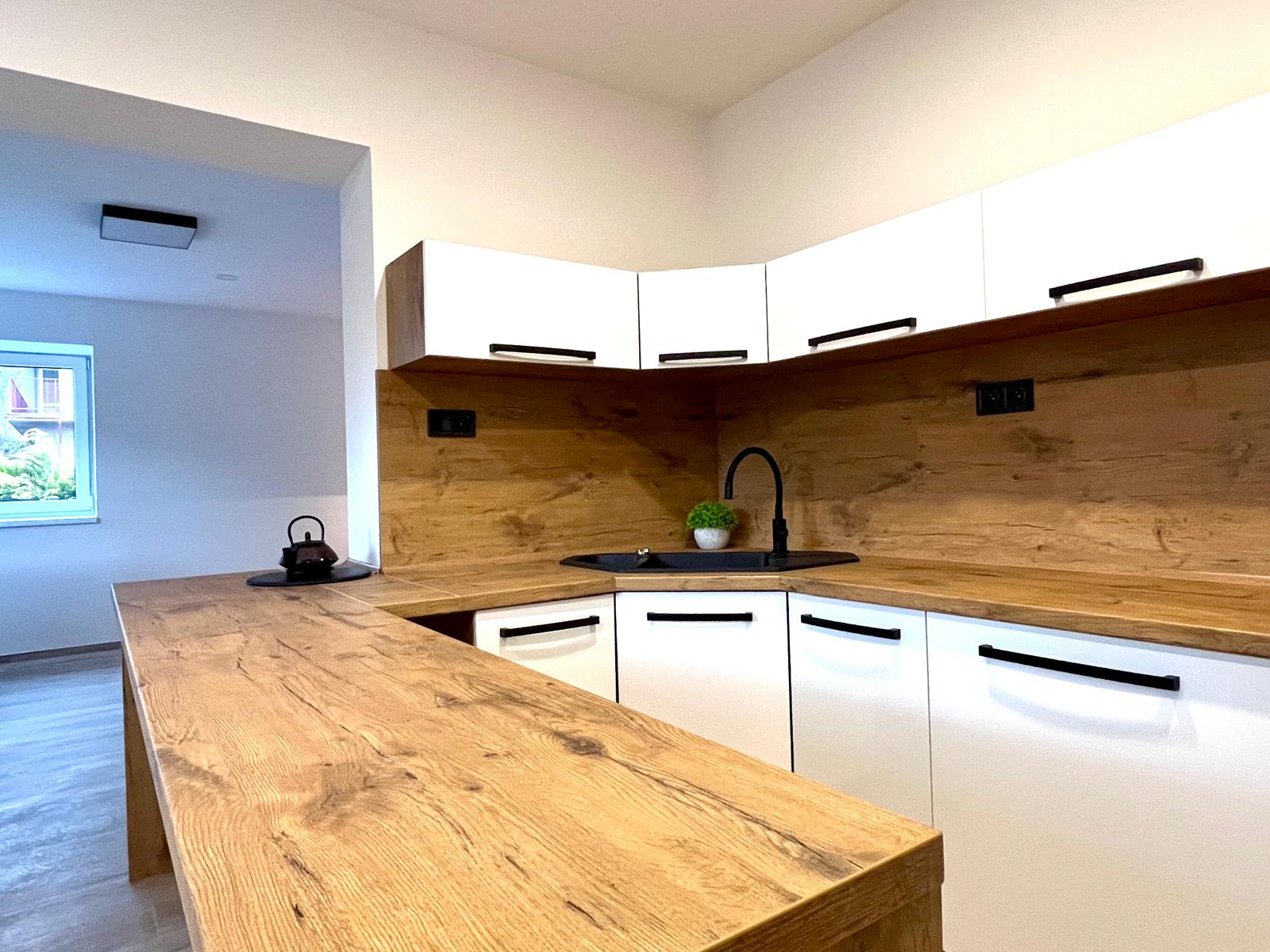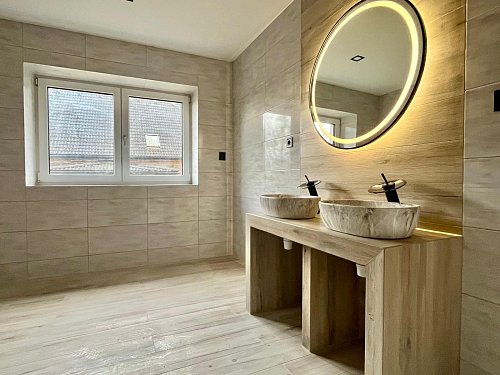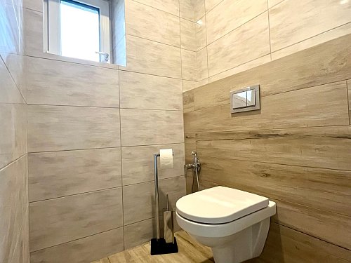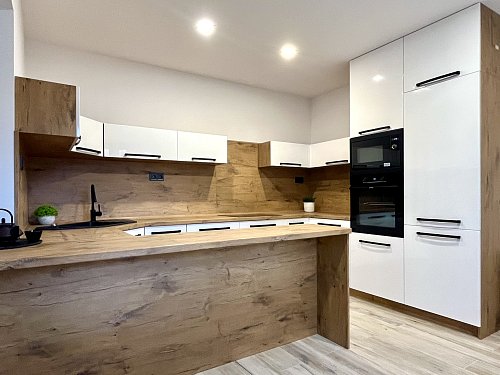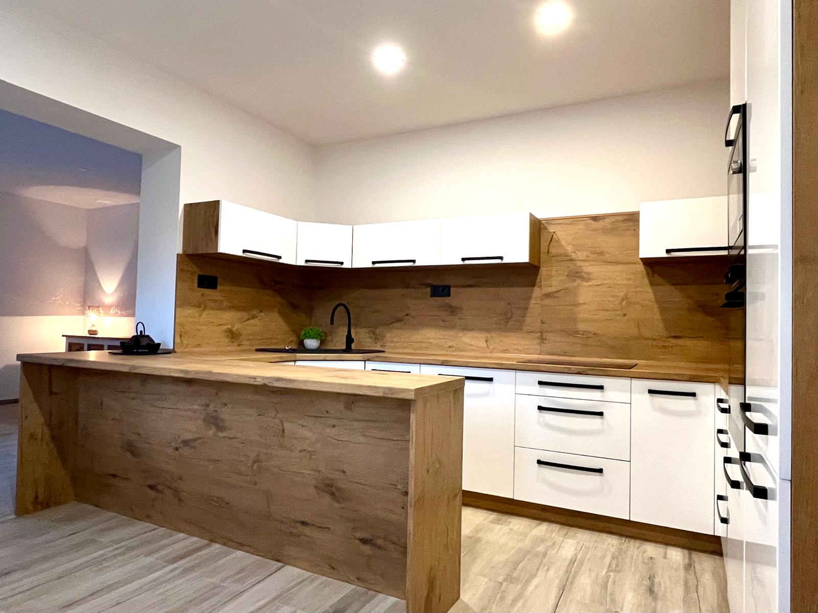 Kuchyň je srdcem tohoto domu, vybavená moderní kuchyňskou linkou v atraktivních barvách a vestavěnými spotřebiči, včetně velké myčky Philco, kvalitní trouby De Dietrich a mikrovlnné trouby stejné značky. Interiér je laděn do příjemných zemitých tónů, což vytváří hřejivou atmosféru, ve které se budete cítit jako doma.